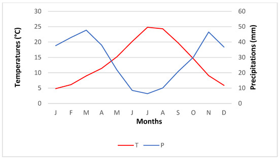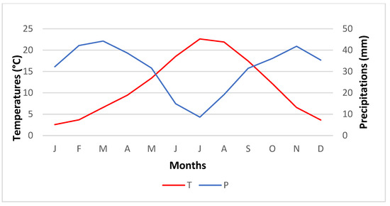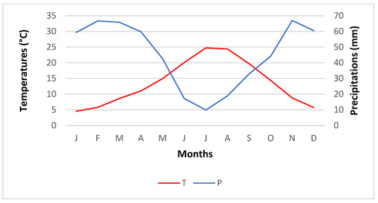 The region features a variety of topographic and climatic characteristics. The terrain is generally mountainous between 540 and 3700 m, and the bioclimatic zones range from semi-arid or subhumid to humid (with precipitation between 550 mm and 700 mm) [19,23,35], with temperatures ranging from below 0 °C in winter to above 40 °C during summer [19]. Generally, the region has a Mediterranean climate characterized by rainy, cold winters and dry, hot summers [24] as confirmed by Figure 2, Figure 3 and Figure 4.