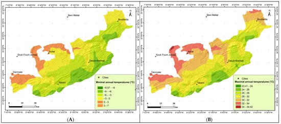 The spatial distribution of minimum, maximum, and annual average temperatures for the entire M’Goun Geopark (Figure 5) illustrates a continentality effect associated with the elevation effect in the Atlas Mountains and the plain. The average annual, maximum, and minimum temperatures are, respectively, around −9.37 °C and 23.4 °C at the mountain peaks and 3 °C and 34. 42 °C at lower elevations.