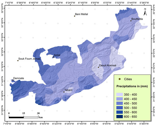 The lowest levels are found in the middle of the Geopark and the highest levels are found in the crests of the Atlas Mountains and the plains. The distribution of precipitation (Figure 6) shows a gradient in terms of elevation, linked to the combined effects of oceanic moisture currents and the Atlas Mountain barrier. Moreover, we observe the presence of two large precipitation depressions linked to site effects and topography. They are located in the Zaouit Ahansal Valley, where precipitation does not exceed 350 mm on average, with a total average between 356 and 622 mm.