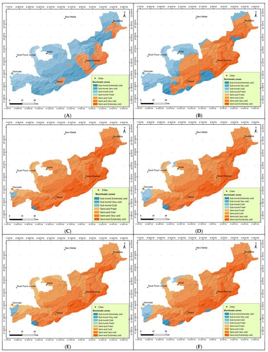 Spatial distribution of bioclimatic zones ((A) 1960–1969), ((B) 1970–1979), ((C) 1980–1989), ((D) 1990–1999) ((E) 2000–2009) and ((F) 2010–2019) in the M’Goun Geopark.