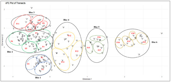 The identification and location of species, using the practical flora of Morocco [38]. The classification adopted was APG III and APG IV [39,40]. In order to identify the different vegetation groups, the Correspondence Analysis (CA) method is utilized. This statistical technique reduces the dimensions of data into a few components to explain variations [41], and is a multivariate method that allows for the elucidation of relationships between biological assemblages of species and their environment [42].