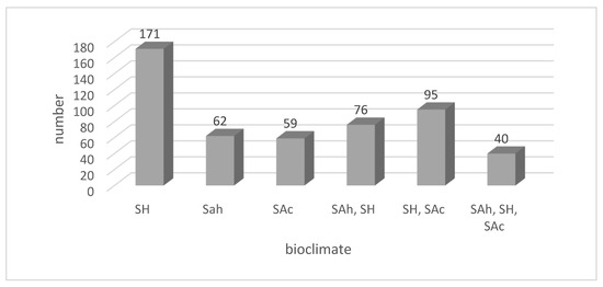 According to the geographic occurrences of the species, 30.53% of species are sampled only in the subhumid climate zone, while 22% occupy the semi-arid level; 52% of them are located in semi-arid fresh and temperate (hot) areas at low elevations, and the rest are situated in the semi-arid cold areas of high mountains. Furthermore, 14% of species are found in both semi-arid hot and subhumid zones, 17% inhabit both subhumid and semi-arid cold zones, and 7% of species colonize all bioclimates in the region (Figure 12).