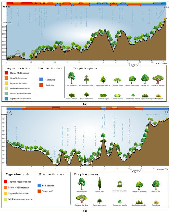 The vegetation profiles. (A) Demnat—Ait Bougemmaz axis, (B) axis Tillouguit—Zaouit Ahensal.