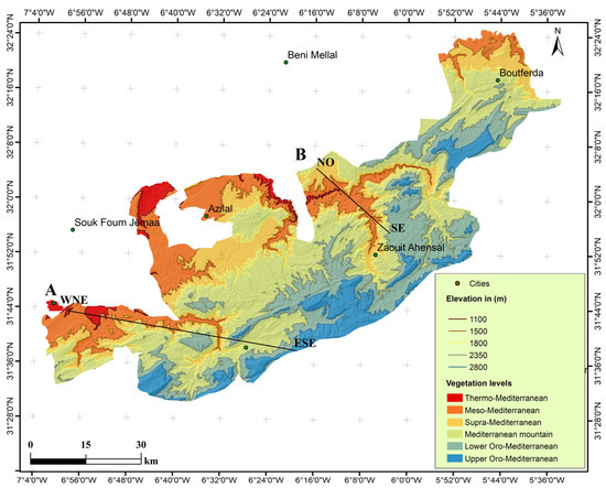 Vegetation levels are vertical distribution or elevational organization of plant cover, generally adopted by exploitation of the synthetic climate of Emberger, Quézel, and Barbero [19,44], the vegetation strata are thermos-Mediterranean, meso-Mediterranean, Infra-Mediterranean, Oro-Mediterranean, mountain Mediterranean [45].