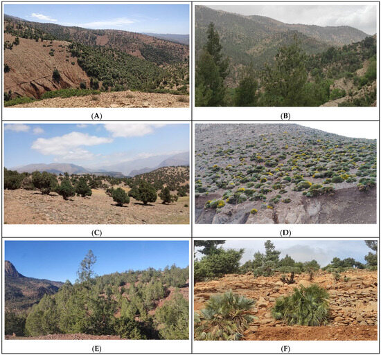 Figure 15 shows the general aspects of some vegetal formation in the area. This region showcases the remarkable biodiversity of the High Atlas ecosystems, yet it is crucial to underscore that many species within these ecosystems are facing significant degradation and threats. This biodiversity decline is further exacerbated by the impacts of climate change. The local population heavily relies on these natural resources for their livelihoods, utilizing them for wood, rangelands, and livestock forage. Therefore, these forests are vital for maintaining biodiversity and supporting sustainable development policies. As a result, the protection and conservation of these forests are of paramount importance to avoid the severe consequences of their loss. Indeed, the loss of biodiversity may lead to a decrease in ecosystems’ climate resilience, accelerating the effects of climate change [61], and this loss reduces the stability of an ecosystem [62]. In addition, biodiversity loss may impact society, economy, health, food environment, societal structures, rural life, food security and livelihoods, and resilience of rural communities profoundly [63]. Several crucial conservation measures are necessary to safeguard the flora of the M’Goun Geopark. These include implementing rigorous investigations and comprehensive ecosystem assessments; establishing a well-defined network of protected areas, carefully selected based on specific criteria (diversity and activities); improving social conditions and local infrastructure to alleviate pressure on natural resources; fostering community engagement through awareness campaigns and active participation in conservation efforts; and utilizing the funding from this study as a foundation for ecosystem restoration and remediation initiatives.