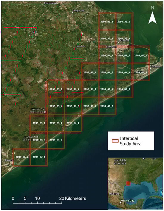 Texas Orthoimagery Program (TOP) aerial photos were downloaded from the Texas Natural Resources Information System (TNRIS) https://tnris.org/ (accessed 19 March 2019). The TOP data were recorded in a 0.5 meter (m) resolution. The 0.5 m orthoimagery covering the entire State of Texas was flown from October 2014 to August 2015, with select areas additionally flown for 6-inch/1-foot orthoimagery. The 2014/2015 Statewide Orthoimagery Project under the TOP was administered by Texas Geographical Information Office, part of the Texas Water Development Board. All orthoimagery acquired under TOP are 4-band (R, G, B, NIR), natural color, and color infrared capable. Orthophotos were organized throughout the project using the United States Geological Survey (USGS) quarter quadrant system, an established grid based on latitude and longitude lines long used by federal agencies. The study area comprised 27 quarter quadrants (QQ), representing areas of West Bay, Swan Lake, Jones Bay, Chocolate Bay, Christmas Bay, Drum Bay, and Oyster Lake (Figure 1). Each QQ covers an area measuring 3.75 min longitude by 3.75 min latitude (or 43 km2). USGS QQ data were also downloaded from https://www.twdb.texas.gov/ (accessed 25 March 2019).