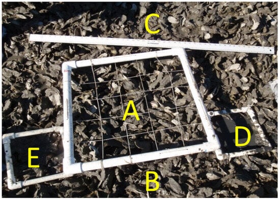 Representative intertidal reefs from each QQ with accessible intertidal reefs were surveyed to determine the physical reef structure and oyster population characteristics. First, reef structure was quantified for percent cover of oyster shell, percentage of live oysters within the oyster shell, and reef height and reef rugosity. For each of these reef characteristics, quadrats (n = 5) were haphazardly deployed across the reef. Percent shell cover and percent live oyster cover were measured with a 0.25 m2 quadrat with 16 evenly spaced points in a 4 × 4 pattern placed on the reef. Under each point, it was determined if live oysters, shell hash, or open bottom was present to estimate total percent reef cover by oyster shell (Figure 2A). The percentage of live oysters was quantified by the number of live oyster points, within the quadrat, divided by the total number of points with shell present (Figure 2A). Reef rugosity, which is a measurement of topographical heterogeneity that provides a relative index of reef complexity [60], was quantified by laying a 1 m chain parallel to each 0.25 m2 quadrat and then measuring the chain distance after conformation with the reef (Figure 2B). Reef height was determined by a measurement of the tallest oyster or culm within the quadrat (Figure 2C). Within each 0.04 m2 quadrat (Figure 2D,E), the shell height (SH) of the first 20 oysters were measured and the remaining oysters enumerated.