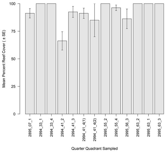 Percent reef cover varied significantly among the QQs (F12,52 = 3.37, p = 0.001); however, this difference was driven by a significantly lower reef cover within a single QQ representative reef (2994_41_2, Figure 3 and Figure 4). The remaining 12 representative reefs were mainly covered by oyster shell (Figure 3).