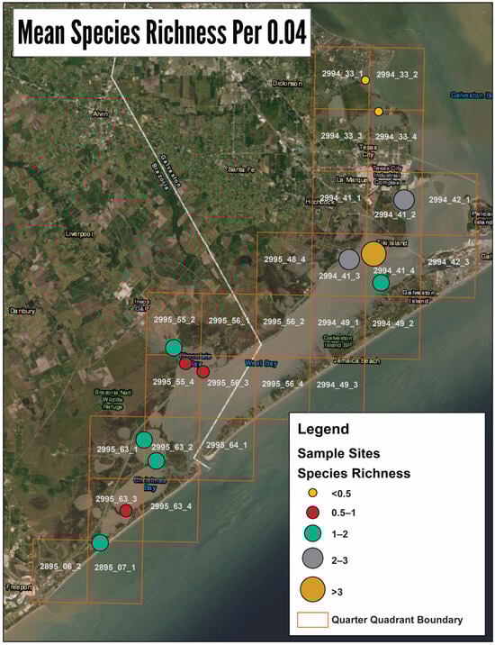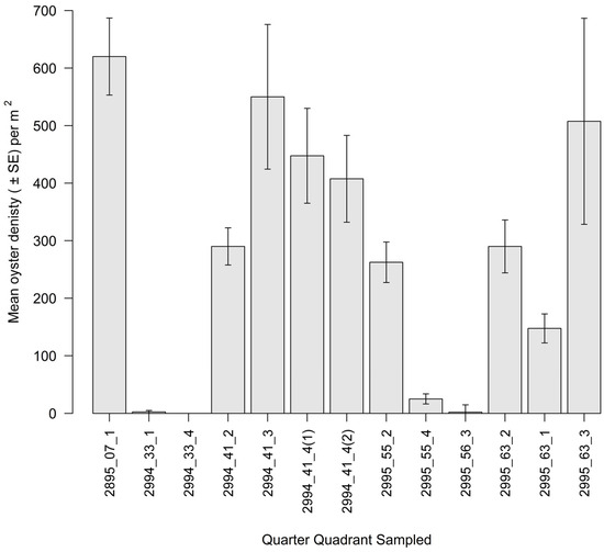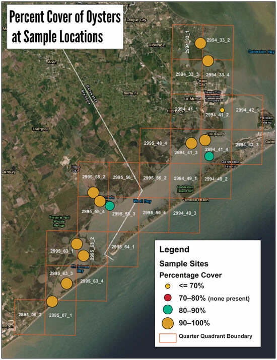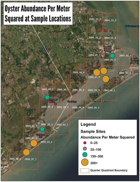 Coupling the GIS analysis of the spatial extent of intertidal reefs and sampling oyster densities on representative reefs enabled the estimation of the intertidal oyster population per QQ. While many representative reefs had no or low oyster densities, potentially skewing the estimation of total oysters for those QQs, two unique patterns emerged. First, in one of the southernmost QQs sampled (289_07_01—Christmas Point), oyster densities on the representative reef were high; however, the overall extent of reef mapped in this area was low. This indicates that while this area of West Galveston Bay can support well-structured intertidal reefs and healthy oysters, the minimal overall area of reef limits the population size of oysters. Conversely, one of the northernmost QQ in West Galveston Bay (2994_41_4—east West Galveston Bay) supported relatively high oyster densities in addition to having 338,312 square meters mapped of confirmed and plausible reef. Therefore, it is estimated that this specific QQ supports the highest oyster abundances in West Galveston Bay, more than threefold compared to other QQs mapped and sampled. Understanding the overall spatial extent of the estimated intertidal oyster abundance by QQ, particularly with high estimated densities (2994_41_4—east West Galveston Bay), is important for restoration practices by providing an estimated standing stock in the event of natural disasters [32,72] and provides target locations for restoration reefs.