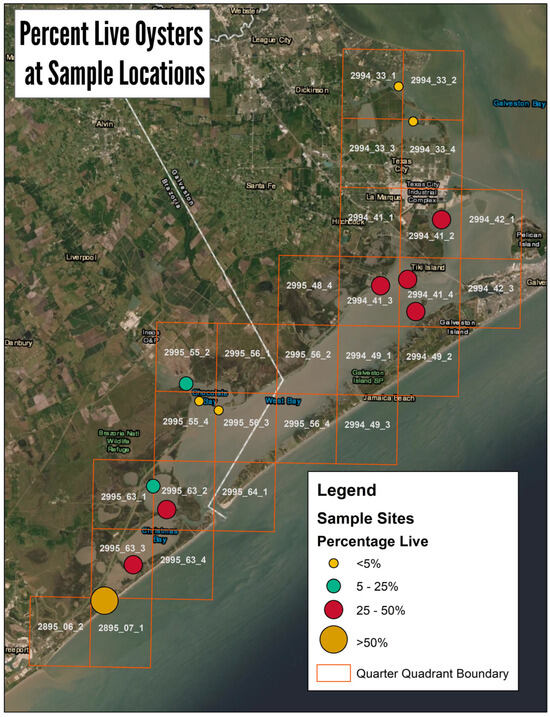 However, the percent of live oysters was more variable among the QQs (F12,52 = 10.29, p < 0.001, Figure 5), with representative reefs with increased percent of live oysters being found in the northern and southernmost ends of West Galveston Bay (Figure 5 and Figure 6).