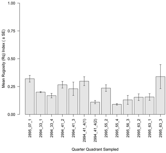 Adjacent to a 0.25 m2 quadrat, the topographical heterogeneity was measured for each reef. Higher Rq values (mean ± SE) represent increased 3D structure on representative reefs [60].