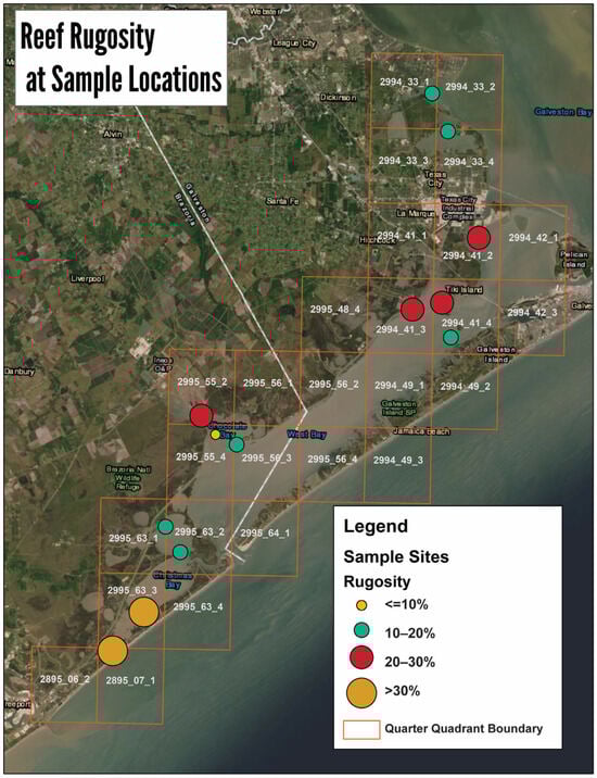 Overall, the reefs exhibited low topographic heterogeneity (Figure 7) but did exhibit significant differences compared to one another (F12,52 = 3.28, p = 0.001). QQs 2995_63_3 and 2895_7_1 had significantly greater complexity compared to QQs 2994_41_4(2) and 2995_5_4. The reefs with the greatest topographical heterogeneity were in the southernmost portion of West Galveston Bay. Intermediate values for rugosity were found in the northern portion of West Bay, adjacent to Galveston Bay proper (Figure 8).