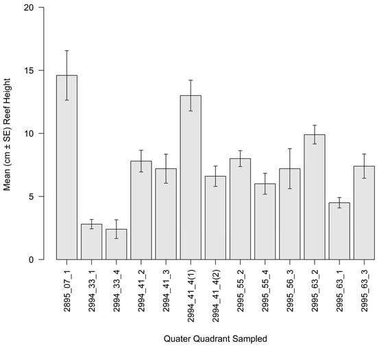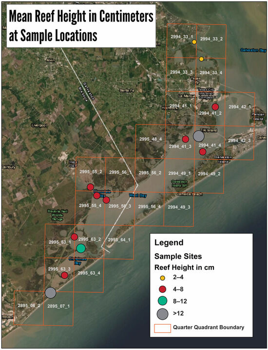 Reef height exhibited similar patterns, as there was a significant difference (F12,52 = 11.29, p < 0.001) between the QQs sampled (Figure 9), with the reefs with the greatest vertical measurements of oysters occurring on representative reefs found at the southernmost end of West Galveston Bay and in the northern portion of West Bay adjacent to Galveston Bay proper (Figure 9 and Figure 10).