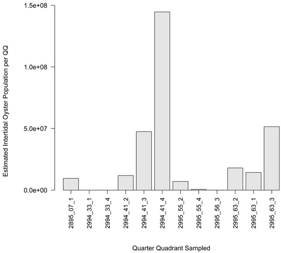 Based on the mapped confirmed and probable intertidal reef area, estimated intertidal oyster populations were calculated for each QQ. When extrapolating densities were based on intertidal reef area, the overall oyster densities decreased in QQ 2895_07_1 (Figure 11) relative to oyster density on the representative reef, and estimates were the highest in QQ 2994_41_4 (Figure 13).
