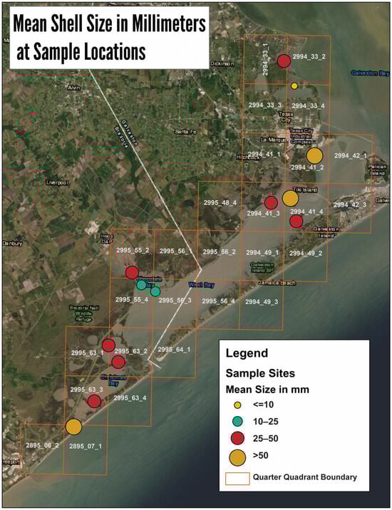 Mean oyster size varied significantly (F11,40 = 8.44, p < 0.001) among the QQs (Figure 14). Those with the largest sized oysters were found on reefs located at the southernmost end of West Galveston Bay and adjacent to Galveston Bay proper (Figure 14 and Figure 15).