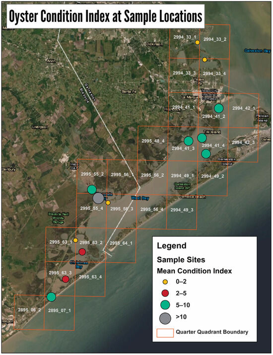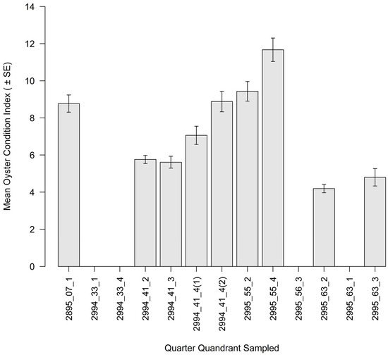 where the internal shell cavity volume was determined as the differential weight between the whole oyster and the weight of the dried empty shell. The CI values provide a relative health index, with poor oyster condition represented by low values and increased health represented by higher values [61,62,63].