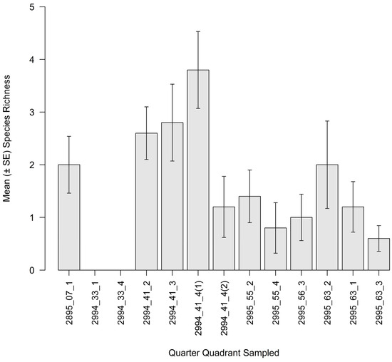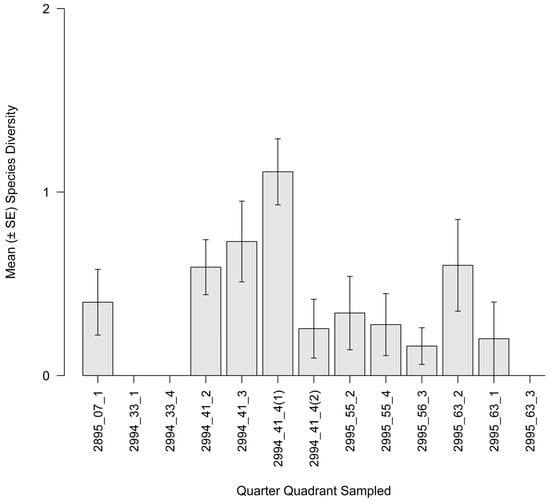 Overall species diversity was low among all the QQ, but did vary significantly among the QQ (F10,44 = 2.99, p = 0.006, Figure 20 and Figure 21). ABM diversity was not significantly influenced by most reef characteristics, as there was no significant relationship with percent cover (r11 = −0.33, p = 0.25) or rugosity (r11 = 0.29, p = 0.32). However, there was a significant relationship between ABM diversity and reef height (r11 = 0.67, p = 0.01), with increased species diversity with increased reef height. Oyster population characteristics did not influence ABM species diversity, as there was no significant correlation between oyster density (r11 = 0.50, p = 0.07) or oyster size (r11 = 0.51, p = 0.07) for ABM species diversity.