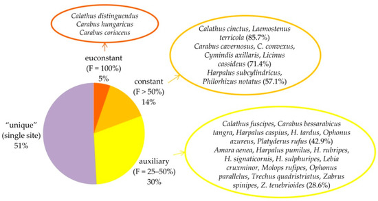 According to their ecological requirements in terms of humidity, the recorded carabid species were divided into six categories: hygrophilous, mesohygrophilous, mesophilous, mesoxerophilous, xerobionts and eurybionts. According to their frequency of occurrence (F), the species were divided into euconstant (F = 100%), constant (F > 50%), auxiliary (F = 25–50%) and accompanying (F < 25%), as the species found in only one sampling site were classified as “unique”.