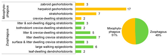The ground beetles from the studied habitats related to two classes of life forms proposed by Sharova [17], with almost equal proportions between the class Zoophagous (28 species, 49.1%) and the class Mixophytophagous (29 species, 50.9%) (Figure 2). This ratio between the classes is quite remarkable and unique for Bulgaria.