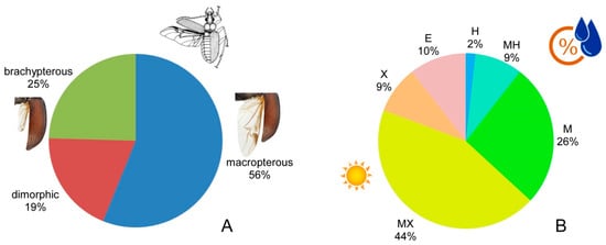 Wing morphology (A) and humidity preferences (B) of the ground beetles from the studied habitats in SCI BG0000322 “Dragoman”: H—hygrophilous; MH—mesohygrophilous; M—mesophilous; MX—mesoxerophilous; X—xerophilous; E—eurybiont.