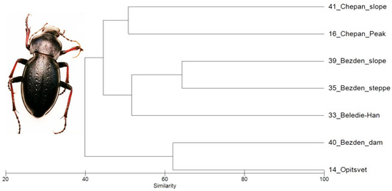 The splitting of the dendrogram at the first level combined into one branch two of the sampling sites having abundant catches of Carabus hungaricus and a landscape with a strong predominance of open rock passages (sites 14 and 40), a likely reason for the similar species composition and its proportional distribution. Both habitats are very insolated and there are large water basins in the vicinity of both sites, at about one or two kilometres away. The second division branched into two clusters. One grouped the two sites from the Chepan Planina Mountain, which are in relatively close proximity to each other and have similar microhabitat and phytocoenotic complexes. The three sites in the second cluster have a similar type of vegetation distribution and landscape mosaic. In addition to the open, sodded habitats, the three sites contain tufts of native woody and shrub vegetation dominated by the typical steppe indicators. This cluster includes the sites with the highest level of similarity (35 and 39), where a single specimen of C. hungaricus was established in each site.