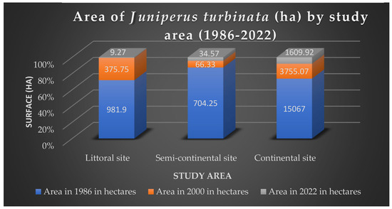 In the continental region, the long-term impact of high demand for firewood and timber, combined with goat overgrazing, has led to a steady decline in J. turbinata populations between 2000 and 2022. The area colonized by Juniperus decreased from 3755.07 ha in 2000 to less than 1609.92 ha in 2022 (Table 4), representing a significant decline rate of 57.15% (Figure 2, Figure 3 and Figure 4 and Table 4).