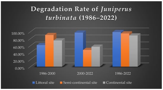 Coastal populations have suffered the most, with a dramatic reduction of 99.05% of the J. turbinata matorral (Figure 3). The semi-continental site also experienced severe degradation, losing 95.09% of its juniper cover. Although continental populations of J. turbinata were relatively well preserved, they still underwent a significant decline of 89.31%. Most of this degradation occurred prior to the establishment of restricted access. To limit further disturbances, the Moroccan Royal Armed Forces created a buffer zone between the Révrins population and the Morocco–Algeria border in the Figuig region, restricting local residents’ movements near the border. This protective measure is particularly beneficial for the continental population, which occupies a large part of the buffer zone. Compared to other study areas, where anthropogenic pressures remain higher, this initiative promotes the conservation and natural regeneration of the stands by reducing human disturbances and grazing, thereby helping to slow down the degradation rate in this region.