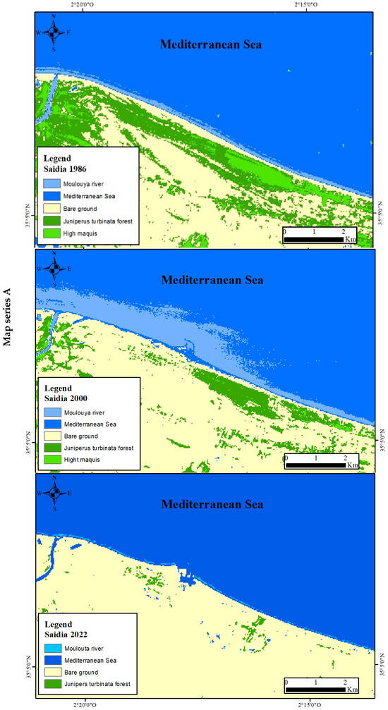 The impact of urbanization is mainly manifested in the coastal zone of our study, while other sites located in regions far from urban centres remain relatively unaffected. The town of Saïdia, nicknamed the “blue pearl” for its 7 km of sandy coastline, experienced a significant increase in population after 1982. This demographic growth is attributed to the rural exodus caused by the droughts of the 1970s and 1980s [54], and to the acceleration of urban expansion [55,56]. Between 1986 and 2000, these dynamics led to the loss of 606.15 ha of forest or 61.73% of the region’s forest cover.