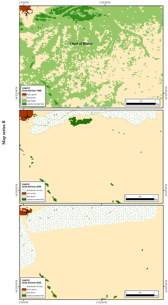 In the semi-continental area, a complex web of factors, including land reclamation, overexploitation, and overgrazing, continues to threaten J. turbinata populations. This has resulted in a 47.89% decrease in the area occupied by these trees, leaving only 34.57 ha currently occupied by Juniperus (Figure 2, Figure 3 and Figure 4 and Table 4).