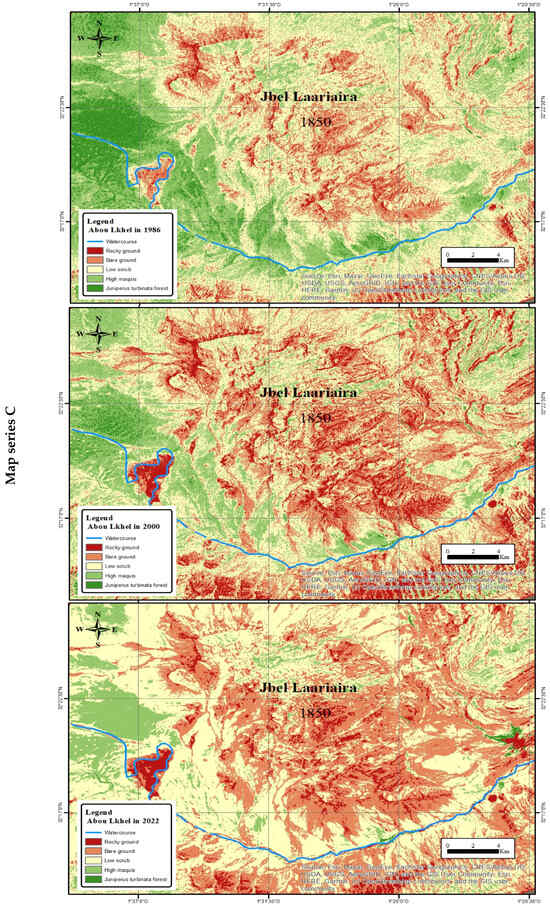 Maps of juniper degradation dynamics between 1986, 2000, and 2022 in the three study areas (A. coastal, B. semi-continental, and C. continental).