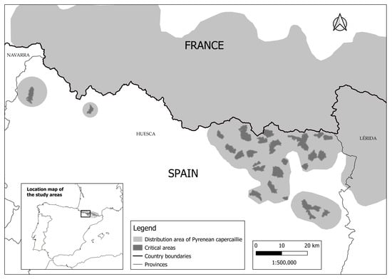 Distribution range of the Pyrenean capercaillie in Aragón and neighboring regions of Spain and France, showing the three study areas within the critical areas for the conservation of the species.