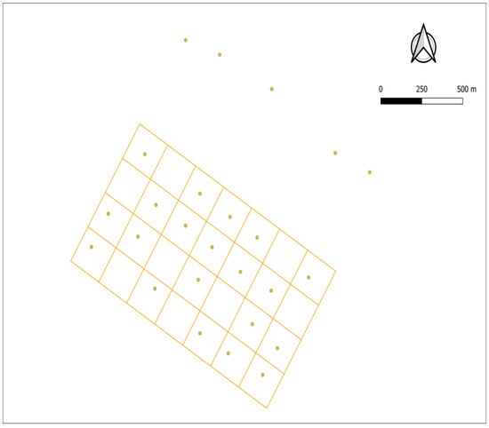 Spatial arrangement of the camera traps in one of the study areas (showing in red the limits of the critical area), in which a total of 20 cameras were deployed in autumn–winter. In this area, 5 cameras were deployed outside the grid to monitor wildlife and possible human disturbances coming from a track.