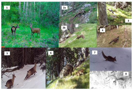 Main group of species photographed at the study sites; (1) cervids, (2) mustelids (pine marten (2a), and unknown mustelid (2b)), (3) corvids (jay), (5) chamois, (6) wild boar, (7) red fox, and (8) rodent (dormouse). The Pyrenean capercaillie was also photographed but at a lower rate (4).
