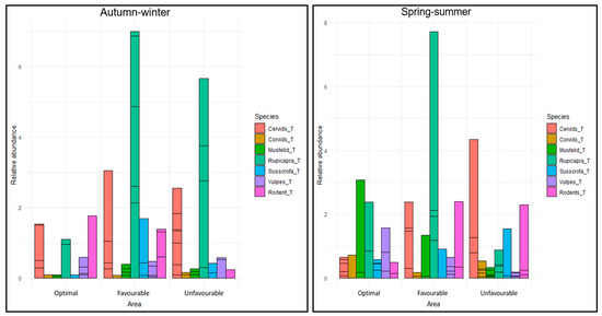 In spring–summer, different patterns were found. In area 1, there were high RAI values for foxes (H = 10.42, p = 0.005), in area 2 for cervids (H = 10.04, p = 0.006), chamois (H = 10.70, p = 0.004), and wild boar (H = 6.74, p = 0.034), and a lower value in area 2 for corvids (H = 7.94, p = 0.018). When comparing the RAIs between the rounds, there were highly significant differences among the areas for mustelids (H = 1080, p < 0.001) and wild boar (H = 1171, p < 0.001; a higher RAI was reported in spring–summer). Moderate evidence was found for differences in the RAI for chamois (H = 2591, p = 0.015), while there was no evidence of differences for rodents (H = 1946.5, p = 0.371) (Table 2, Figure 5).