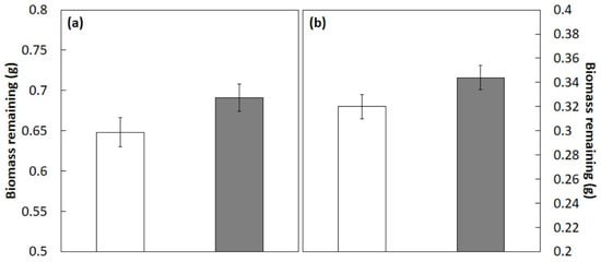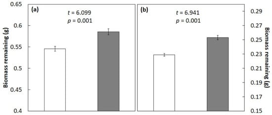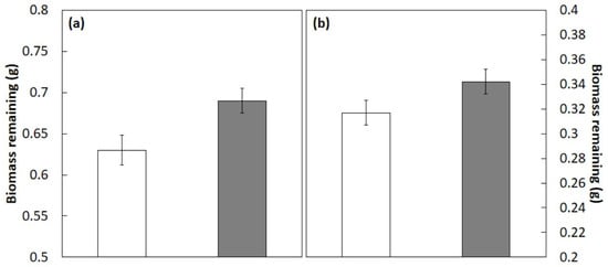 Litter biomass remaining after 3 months (a) or 6 months (b) of incubation in a Guam field study. Original 1 g of litter tissue was derived from 12 plant species from Guam’s northern karst forests that were mixed 50:50 with Cycas micronesica litter. Open bars represent the additive mean, shaded bars represent the actual biomass. Mean ± SE, n = 48. Differences significant at p < 0.001.