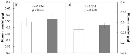 Litter biomass remaining after 3 months (a) or 6 months (b) of incubation in a Guam mesocosm study. Original 1 g of litter tissue was derived from a 50:50 mixture of Cycas micronesica litter and Serianthes nelsonii litter. Open bars represent additive mean, and shaded bars represent actual biomass. Mean ± SE, n = 4.