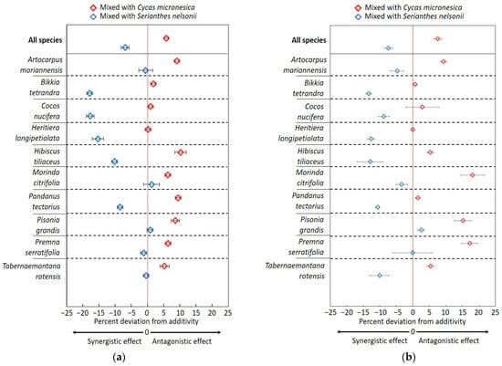 Graphic comparison of mixing the litter of 10 Guam forest species with Cycas micronesica litter or Serianthes nelsonii litter after (a) 3 months of incubation and (b) 6 months in a mesocosm. Original 1 g of litter tissue was derived from a 50:50 mixture. Vertical red line is additivity.