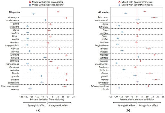 Graphic comparison of the mixing litter of 12 Guam forest species with Cycas micronesica litter or Serianthes nelsonii litter after (a) 3 months of incubation or (b) 6 months in a field litterbag study. Original 1 g of litter tissue was derived from a 50:50 mixture. Vertical red line is additivity.