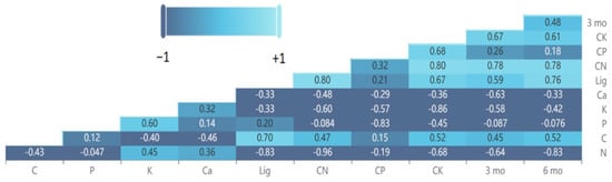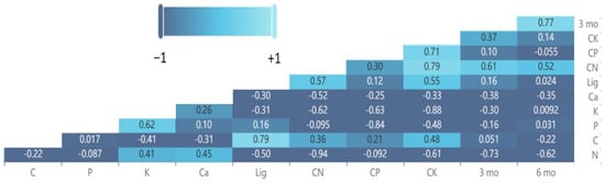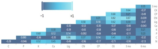 Heat map and coefficients for Pearson correlations among the leaf litter of various litter species mixed with Cycas micronesica litter after 3 and 6 months of incubation in a field litterbag study. Lig = lignin.