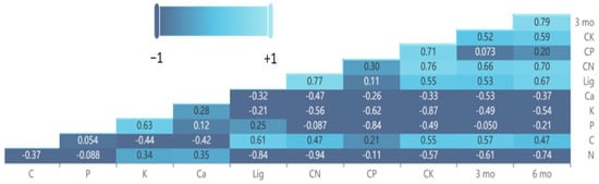 Heat map and coefficients for Pearson correlations among the leaf litter of various litter species mixed with Cycas micronesica litter after 3 and 6 months of incubation in a mesocosm litterbag study. Lig = lignin.