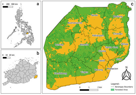 Overview maps showing the location of the study area: (a) national—Bohol Island on a map of the Philippines, (b) regional—location of Anda municipality on a map of Bohol, and (c) local—map of the total land area of Anda on the eastern tip of Bohol, surveyed in the period June–September 2023.