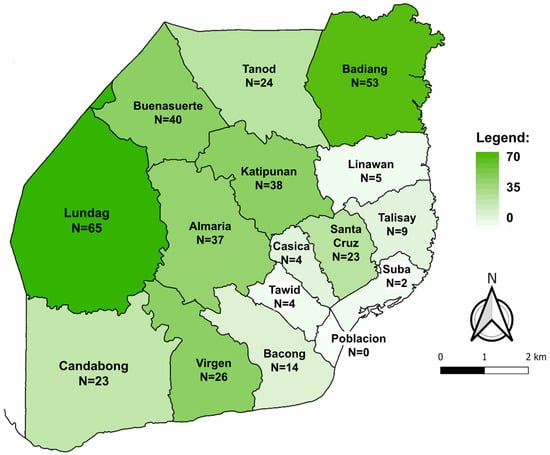 We conducted this study at the furthest eastern tip of Bohol, the Municipality of Anda [9°43′–9°48′ N, 124°30′–124°35′ E (Figure 1)]. The municipality spreads across a total land area of 6,885.12 ha with the highest elevation of 300 m a.s.l. According to the last Census of Population and Housing, Anda is inhabited by 17,778 people living in 16 villages (an administrative unit called a “barangay” in the Philippines) [44]. The poverty incidence of the municipality was assessed at 26.1% [45]. The landscape is not uniform across the municipality, with most of its northern area consisting of mountain ranges that gradually flatten as the land reaches the southern coastal area. Along with Alona Beach on Panglao Island, Anda is considered one of the prime tourist destinations in the Province of Bohol due to its picturesque coasts and pristine beaches.