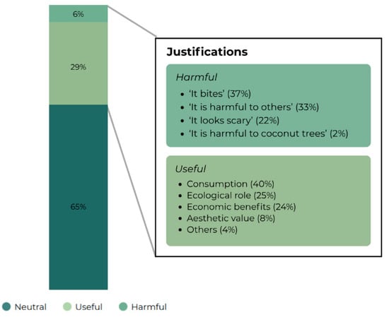 Most respondents held a neutral attitude towards the Philippine colugo, followed by those finding the species useful, and a small number finding it harmful (Figure 4). Out of those who justified the usefulness of the Philippine colugo, all but one (N = 136) provided further justification for their answer. Most of these interviewees perceived the species as useful for its consumption (“can be eaten”), ecological role (“helps balance the ecosystem”, “serve as seed dispersers”), economic benefits (“tourist attraction”, “profitable”), aesthetic value (“enjoyable/nice to look at”), and others (“good as a pet”, “can be hunted”) (Figure 4). Similarly, all but one (N = 27) respondents justified why they think the colugo is harmful: “it bites”, “it is harmful to others”, “it looks scary”, and “it is harmful to coconut trees” (Figure 4).