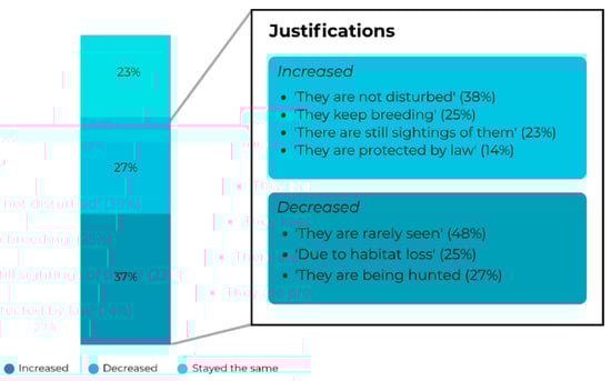 Perception of the Philippine colugo’s population trends of local people in Anda, Bohol (N = 471) with justifications provided for “increased” (N = 151) and “decreased” (N = 112) (June–September 2023).