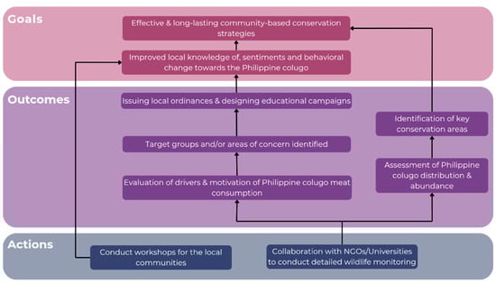 We gathered data on the Philippine colugo distribution, population trends, and threats, as well as gauged the level of knowledge of and attitudes towards the species in Anda. The majority of local people recognized the species and witnessed it, most frequently on coconut trees between afternoon and evening. Anda residents’ knowledge of the colugo diet and distribution is rather low. Local people obtain information on the species primarily through word-of-mouth and their own observations. Furthermore, local people hold mainly neutral perceptions towards colugos, but positive conservation sentiments prevail. Finally, consuming colugo meat is the main threat to the species’ population in Anda. This study provides baseline data for future research and conservation, and we recommend a few actions to be taken, which we present in a conservation framework for the policy makers and other stakeholders concerned (Figure 6).