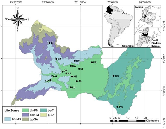 This study was conducted at 15 sites in the Upper Magdalena River Valley, Colombia (Figure 1; Table S1), located between the Central and Eastern Cordilleras of the Colombian Andes. These sites are characterized by a tropical climate and elevations ranging from 400 to 2000 m a.s.l., with ecosystems ranging from tropical dry forest to premontane wet forest and lower montane moist forest. The region has an average temperature of 27 °C and an average annual precipitation of 1307 mm [32], with a bimodal rainfall pattern occurring two rainy seasons from March to May and from October to November and two dry seasons from December to February and from June to September [33].