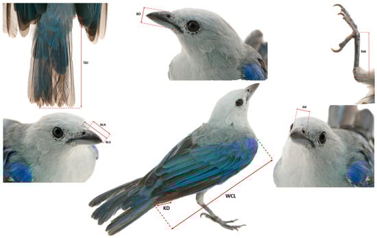 We used life history, morphological, and behavioral traits to assess functional diversity. Initially, nine continuous morphological traits, including bill length measured from tip to skull (BLS), bill length measured from tip to the front edge of the nares (BLN), bill width (BW), bill depth (BD), wing chord length (WCL), Kipp’s distance (KD), tail length (TAI), tarsus length (TAR), and body mass (MA) (Figure 2), along with two ecological variables (trophic niche and habitat type) were considered. Each species was assigned to one of nine trophic niches (granivore; nectarivore; frugivore; terrestrial herbivore; omnivore; invertivore; vertivore; aquatic predator; and scavenger) and one of eight habitat types (forest; woodland; wetland; grassland; riverine; rock; shrubland; and human-modified) [40].