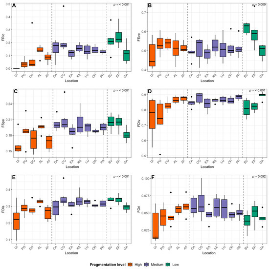 Comparison of functional alpha diversity indices bird assemblages: (A) functional richness (FRic), (B) functional evenness (FEve), (C) functional specialization (FSpe), (D) functional divergence (FDiv), (E) functional dispersion (FDis), and (F) functional originality (FOri). Black dots represent outliers. Site abbreviations: UI = Universidad de Ibagué; PO = Potrerillo; DO = Doima; AL = Los Alpes; AF = Agua Fría; CA = La Carpintería; CO = Paraíso de Cocora; EA = Entre Aguas; KE = Kenisha; LU = La Lucia; OR = Orquídeas del Tolima; PR = La primavera; BV = Bella Vista; EP = El Palmar; GA = Gaia.