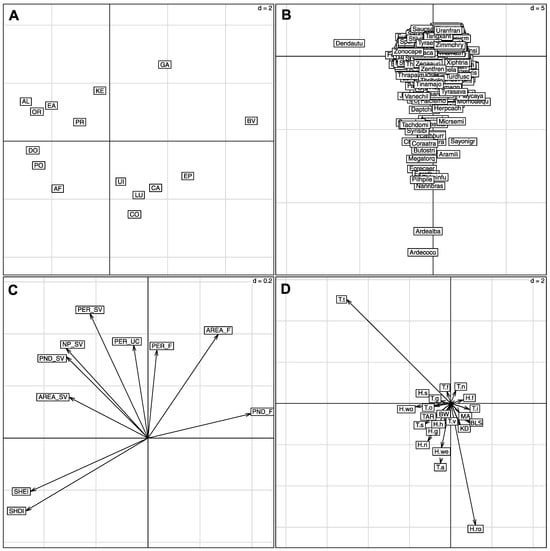 - Dray, S.; Choler, P.; Dolédec, S.; Peres-Neto, P.R.; Thuiller, W.; Pavoine, S.; ter Braak, C.J.F. Combining the fourth-corner and the RLQ methods for assessing trait responses to environmental variation. Ecology 2014, 95, 14–21. [Google Scholar] [CrossRef]