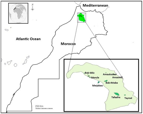 The study area lies within the Jbel Bouhachem massif in the western part of the Rif mountain range in northern Morocco (Figure 1). This territory is of exceptional natural, archeological, historical, and religious value. Due to its ecological richness, it has been granted several national and international conservation statuses. It is entirely included within the Mediterranean Intercontinental Biosphere Reserve (MIBR), officially recognized by UNESCO on 25 October 2006 [17]. The site also hosts a priority conservation area under the Important Plant Areas (IPAs) of the Mediterranean [18]. At the national level, it has been designated as a first-priority Site of Biological and Ecological Interest (SIBE), as identified in the Master Plan for Protected Areas [19].